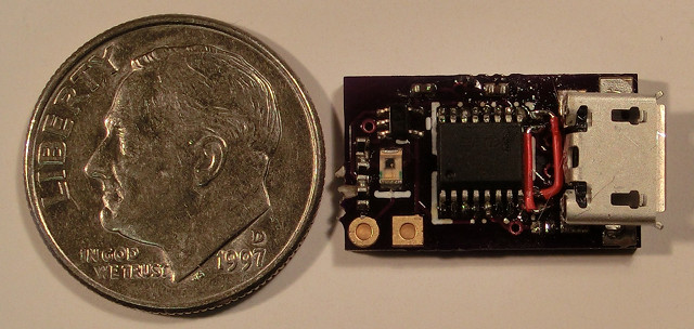Once I had that working, I copied the schematic to gschem, designed a board and had three made at OSHPark for the phenomenal sum of $1.35.