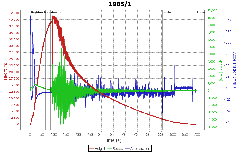 Even with the drogue safely fired at apogee, the descent rate rose to over 200m/s in the rarefied air of the upper atmosphere. With increasing air density, the airframe slowed to 30m/s when the main parachute charge fired at 2000m. The larger main chute slowed the descent further to about 16m/s for landing.
