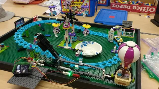This model uses the Circuit Cube motors that I discovered last month. There's one visible near the middle of the Ferris wheel and another one just behind the Duemilanove board driving the balloon mechanism.