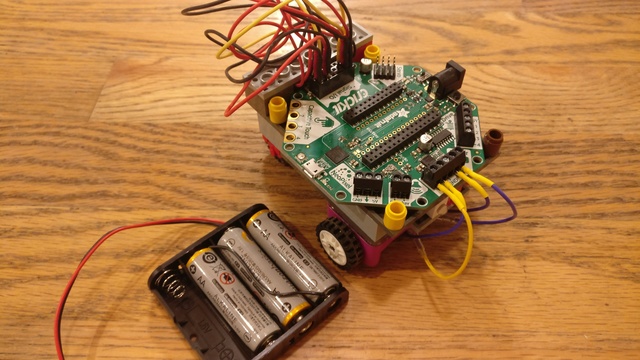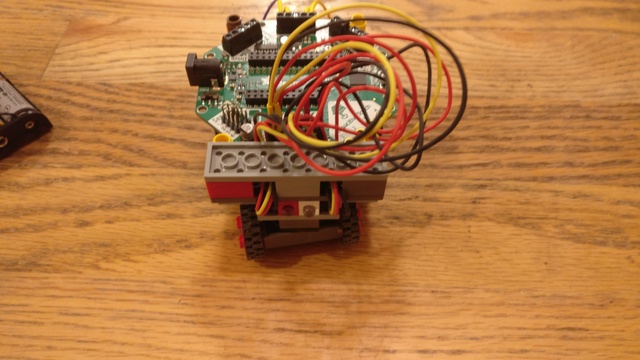 And here's the car from the rear showing the motor connections, the other light sensor/light combination and the battery pack: