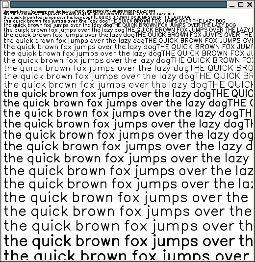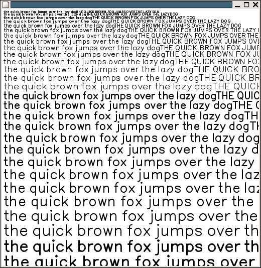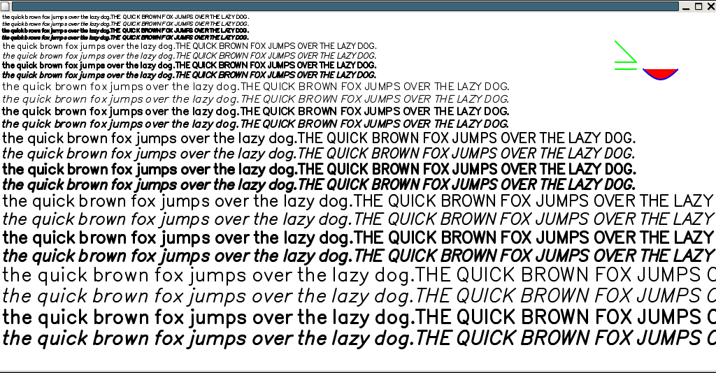 Instead, some significantly smaller solution was needed. One easy solution was to just take outlines from some font, convert them to a compact format and rasterize them with the existing twin drawing code. I gave this a whirl with the Bitstream Vera Sans Roman type face. The results of that experiment are available here. As you can see, the lack of hinting makes the glyphs very fuzzy all over. It's a long ways from the quality available on my laptop screen, but it is workable and provides access to a huge set of fonts.